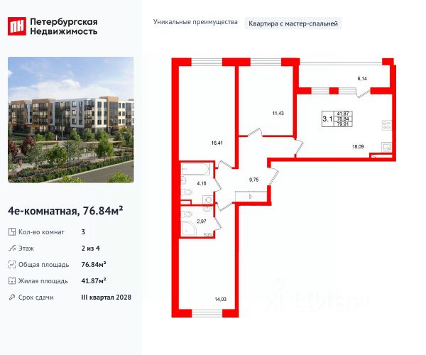 Продается уютная, семейная 3-комнатная квартира от застройщика в жилом комплексе "Универ Сити" в на юге Санкт-Петербурга. До метро можно добраться на транспорте всего за 30 минут. Мастер-спальня с собственной ванной комнатой. Самое приватное пространство в вашей квартире. Уникальная, функциональная европланировка, большая кухня-гостиная 18.34 м², вместительная прихожая 9.23 м². Общая площадь квартиры - 75.5 м², жилая 40.99 м², высота потолка 3.07 м. Квартира продается с отделкой "Норд Лайн серый". Что особенного в ЖК "Универ Сити"? • Малоэтажное строительство • Скандинавские фасады с отделкой керамогранитом, акцентные входные группы • Закрытые внутренние дворы без машин • Пешеходный променад с тематическими зонами, еловый сквер и яблоневый сад • Univer Park, включая SetlSport и SetlKids, площадку для выгула собак и зоны отдыха • Инновационный Лицей Setl с оригинальной архитектурной концепцией и уникальной образовательной средой