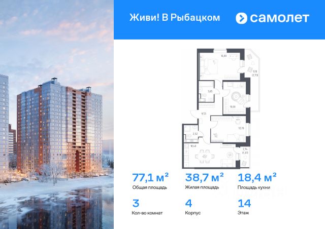 В продаже 3-комнатная квартира в корпусе 39 ЖК 'Живи! В Рыбацком'. Квартира располагается на 18 этаже, общая площадь 77.1 м2.