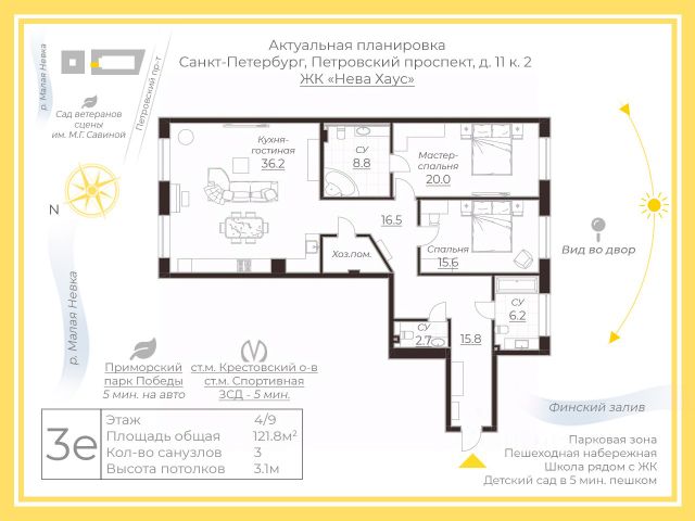 Арт. 116644784 Единственная по настоящему видовая квартира в комплексе 17/33. Чьим продолжением из панорамных окон будет исторический Петербург со всеми его доминантами, романтикой крыш и ночным блеском большого города. Переуступка прав ДДУ. Это одна из 8 резиденций корпуса Residence, которые смотрят именно в сторону Центрального и Василеостровского района. Квартира общей площадью 130м2 расположена на 6 этаже тем самым она возвышается над соседним домом, её видовым характеристикам ничего не мешает и без преувеличения является "квартирой шкатулкой" чьи характеристики превышают и дополняют и без того по настоящему шикарный Жилой Комплекс со всеми его преимуществами и так обо всём по порядку: Квартира с эргономичной и правильной планировкой, которая включает в себя две спальни (20м2+14м2) и кухню-гостиную 52м2, гардеробных, трёх сан узлов, трёх, один из которых с панорамным окном. Если посмотреть на планировочные решения в комплексе таких квартир всего 6 и эта квартира на 6 этаже. В комплексе есть вся ключевая инфраструктура: фитнес и СПА, кинозал и зал для семейных торжеств, коворкинг и детский клуб, лаундж с библиотекой и терраса площадью 120 кв. м для резидентов. "Небесная гостиная" - атмосферное пространство на крыше с панорамным рестораном от Freza Group и невероятными видами на панораму города. Отличная и развитая транспортная доступность: близкий выезд на ЗСД, близость метро и автобусных остановок, а также наличие причалов, откуда Вы можете уйти на своей или арендованной яхте. Продаётся физическим лицом. Чтобы уточнить условия сделки - звоните сегодня! 3-комнатная квартира на острове Петровский в Санкт-Петербурге.