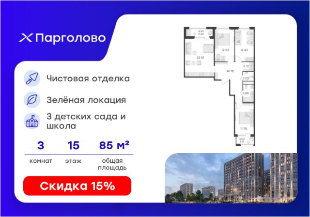 Дом сдан. Ключи сразу. Ипотека с господдержкой. Продается просторная трехкомнатная квартира: общая площадь 95.4 м2, жилая 46.2 м2, высокие потолки 2.73 м. Возможен заказ чистовой отделки. Планировка грамотно продумана для жизни большой семьи: просторные комнаты, широкий коридор, два санузла, качественная шумоизоляция. В этой квартире всем будет комфортно!В квартире есть обособленное крыло, состоящее из пятиугольной комнаты и санузла. Домочадцам, которые любят приватность, наверняка понравится это оригинальное решение. Две другие комнаты практически одинаковы по размерам.Прямоугольная кухня-гостинная площадью 21.1 м2 это самое просторное и самое светлое (с двумя окнами) помещение в квартире. Здесь комфортно не только готовить, но и устраивать семейные посиделки. Из кухни есть выход на треугольную лоджию, откуда можно обозревать аккуратный двор и парк. Двор жилого комплекса закрыт от чужаков, в ЖК работает служба охраны, ведется круглосуточное видеонаблюдение. На территории выполнено озеленение, предусмотрены игровые и спортивные площадки, зонированы места для отдыха и прогулок.ЖК "ПРАГМА city" выполнен по прочной и долговечной монолитной технологии, срок его службы составляет минимум 150 лет. Дом сдан и заселяется, ключи выдаются сразу после покупки. Все новоселы получат огромный бонус в виде расположенного буквально через дорогу знаменитого Шуваловского парка. Это красивое и экологически чистое место не зря считается наследием ЮНЕСКО: здесь множество природных и исторических достопримечательностей. Гулять по бывшим графским угодьям всей семьей пешком либо прихватив велосипеды или самокаты настоящее удовольствие!Транспортная доступность локации на высшем уровне. До станции метро "Парнас" 15 минут пешком. Рядом выезды на КАД, Выборгское ш-се и пр. Энгельса, по которым можно добраться в любые районы города, включая центр. Любителям чуть более дальних прогулок несложно будет прокатиться до курорта "Охта-Парк", Новоорловского заказника или Суздальских озер. А то и умчаться к живописному Карельскому перешейку, который находится в пределах часа езды! Продается 3-комнатная квартира в микрорайоне Парголово в Санкт-Петербурге.