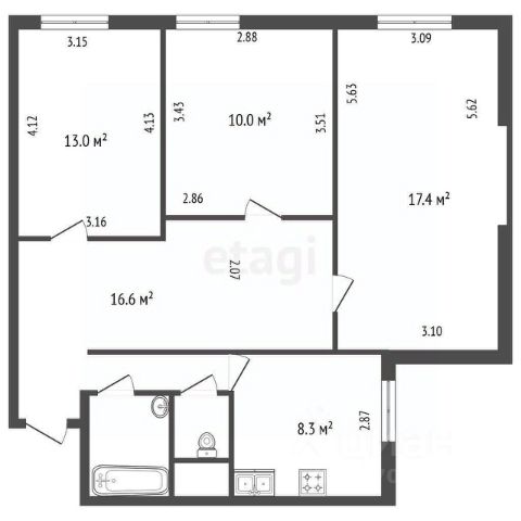 • Характеристики: Жилая площадь — 48,4 кв. м (комнаты: 17.2 + 14.1 + 17,1 кв. м), кухня — 8,5 кв. м, высота потолков — 2.65 м.