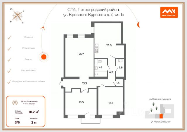 Арт. 127774918 Вы в поиске семейной квартиры? - если так, то Вы её нашли! Наше предложение на 100% соответствует всем ожиданиям, которые хочет получить покупатель квартиры для своей семьи: Безопасная, спокойная улица, станция метро Спортивная в 7 минутах пешком, Чистая парадная без коммунальных и арендных квартир, спокойные, дружные соседи, Надежный, крепкий дом - Сталинка - бетонные перекрытия, отличная шумоизоляция, Для Ваших детей - рядом 4 детских сада с хорошими отзывами, напротив дома - Санкт-Петербургская классическая гимназия, Для Вас - вся инфраструктура рядом, супермаркеты, кафе, места для пробежек, бассейн, фитнес и тенисные клубы - все в пешей доступности, Зеленый, закрытый, тихий двор с детской площадкой, Для прогулок - Петровский парк, Крестовский остров, Правильная планировка и площадь - кухня-гостиная 23 кв. м, изолированная от спален, три отдельные комнаты квадратной формы по 26, 18 и 18 кв. м, балкон с хорошим видом, Места хранения - объемные ниши для встроенных шкафов, наличие гардеробной 4 кв. м. и постирочной, Высота потолка 3 м, Комфортный третий этаж - удобно для колясок и игрушек, видно детскую площадку, Квартира освещается солнцем в течение дня - окна выходят на юго-запад и северо-восток, Качественный ремонт, выполненый год назад, после которого в квартире никто не проживал - замена всех коммуникаций, использование премиальных материалов - паркет, мраморные широкие подоконники, венецианская штукатурка, etc. Мы готовы к сделке - это прямая продажа, без обременений, по полной стоимости в договоре и присутствием собственника на сделке. Звоните, записывайтесь на просмотры - эта квартира создана для тех, кто хочет растить детей, принимать друзей, хранить традиции и строить будущее своей семьи! Предлагаем ПРЕМИАЛЬНОЕ обслуживание для требовательных клиентов. Оперативно организуем просмотр, предоставим полную информацию по объекту. 20 лет работы с требовательными клиентами подготовили нас к решению ВАШИХ сложных задач. Будем рады знакомству! Ул. Рубинштейна, д.8.