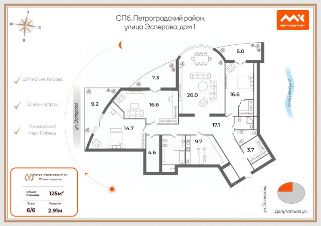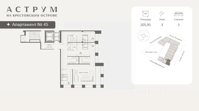 Клубный дом находится в восточной части Крестовского острова, где расположены преимущественно фешенебельные дома, что обеспечивает высокий статус окружения. Дом построен по проекту архитектурного бюро DBA в неоклассическом стиле. Фасады дома выполнены из светлого натурального камня и архитектурного бетона, с декоративными металлическими элементами. Свободные планировки квартир большой площади с панорамными окнами и французскими балконами идеальное пространство для воплощения самых смелых дизайнерских решений Проект объединяет 58 президенций: квартиры и апартаменты площадью 130 - 292 кв. м,. таун-виллы с отдельным входом и собственным зеленым патио, пентхаусы с террасами 160 - 500 кв. м. Высота потолков помещений варьируется 3,15 - 3,3 м. В комплексе предусмотрен двухуровневый паркинг на 102 машино-места, оборудованный зарядками для электромобилей, а также 17 келлеров площадью 3- 35 кв. м. Территория благоустроена и закрыта от посторонних, работает круглосуточное видеонаблюдение и система контроля доступа. В домах установлена IP-домофония с возможностью удаленного видеоконтроля. Резидентам доступны спа-зона, бассейн, хамам, финская сауна, гидромассаж, фитнес-зал, а также круглосуточный консьерж-сервис. В радиусе 2 км доступны детские сады, школы, медицинские учреждения, кафе, рестораны, магазины, спортивные клубы, яхт-клуб, Елагин остров, Приморский парк Победы и Диво-остров. Газпром Арена находится в 3 км. За 10 минут транспортом можно выехать на ЗСД, а дорога до центра Санкт-Петербурга занимает около 25 минут. 3-комнатная квартира на улице Эсперова в Санкт-Петербурге.