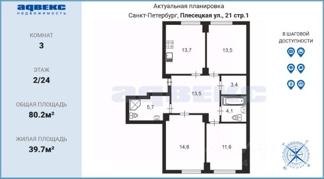 • ✓ В базе объявлений Циан 132 3-комнатных квартир на улице Плесецкая в Санкт-Петербурге.