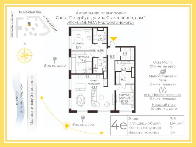 Квартира с тремя спальнями в ЖК "Малоохтинский, 68" на 2 этаже. Квартира - распашонка, без проходных комнат, окна выходят на paзные стороны дома. В квартире один совмещенный и один раздельный санузел. Высота потолков 3.0 м. "Малоохтинский, 68" жилой комплекс бизнес-класса в центре Санкт-Петербурга, на берегу Невы, между Малоохтинским проспектом, Заневским проспектом и улицей Стахановцев. "Малоохтинский, 68" состоит из 16 секций: монолитные дома с остекленными фасадами. Главная входная группа выдержана в европейском стиле с использованием натуральных отделочных материалов. Просторные светлые вестибюли с панорамными окнами, помещение для почтовых ящиков, стойка консьержа, велосипедные и колясочные. Квартиры с черновой отделкой, чтобы каждый покупатель мог обустроить жильё по своему вкусу и предпочтениям. На территории "Малоохтинского, 68" будут детские площадки, тренажеры для спортивных занятий и игр, зоны для спокойного отдыха. Жилые секции асимметрично расположены на территории и окружены оазисами зелени. Срок сдачи 4 квартал 2024 года. Территория комплекса закрыта. "Малоохтинский, 68" располагает двумя паркингами: подземным на 490 м/м и наземным на 76 м/м. Жилой комплекс находится в районе с развитой инфраструктурой и удобным транспортным расположением: 10 минут пешком до станции метро "Новочеркасская" и Малоохтинского парка, 5 минут до набережной реки Невы, 2 км до станции метро "Площадь Александра Невского". Вокруг много достопримечательностей: комплекс Александро-Невской лавры, Смольный собор, самый высокий мост через Неву в черте города мост Александра Невского. В районе есть школы, детские сады, медицинские центры и поликлиники, супермаркеты, кафе, рестораны, торговые центры. Продается 3-комнатная квартира на улице Стахановцев в Санкт-Петербурге.