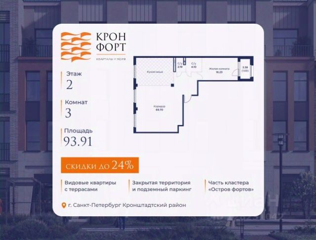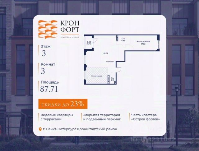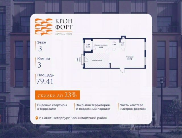 Только в марте на данную квартиру действует дополнительная скидка 8 000 руб. с кв.м. Стоимость квартиры в объявлении указана со скидкой 21%. Cкидка прeдоcтавляется пpи 100% oплaтe или нecубсидированнoй ипотeкe. Возможно повышение скидки до 24%. Подробности уточняйте в отделе продаж. Предлaгaeтся квартира плoщaдью 74.37 кв.м в жилом кoмплексе "Kронфoрт. Центpальный" в Санкт-Петeрбурге (Кронштадт). Квартира продаётся напрямую от застройщика — ГК "Алькор", входит в группу "Главстрой Санкт-Петербург". Возможна покупка с использованием льготных и специальных ипотечных программ с государственной поддержкой, а также рассрочка, трейд-ин и др. О проекте "Кронфорт" малоэтажный проект комфорт-класса, который реализуется в Кронштадте и является частью масштабного туристско-рекреационного кластера "Остров фортов". Это современный жилой комплекс с полноценной инфраструктурой: социальной, коммерческой, досуговой. Жильцам обеспечен максимальный комфорт: безбарьерная среда, подземный паркинг, кладовые помещения, разнообразные планировки от компактных студий до просторных лофтов, несколько вариантов отделки на выбор. Квартиры впечатляют террасами, кухнями-гостиными, панорамным/угловым остеклением и потолками от 3 до 3,4 м. Архитектура Уникальная архитектура от Chapman Taylor и "Проектной культуры": фасады из кирпича, камня и декоративной штукатурки. Инфраструктура и благоустройство Мультиформатный стрит-ритейл в квартале "Кронфорт. Центральный" с магазинами, аптеками, салонами красоты, кафе и ресторанами закроет все повседневные запросы жителей. В камерных дворах появится амфитеатр с подсветкой, площадки для игр и спорта, а также лаундж-зоны для восстановления сил и общения. Среда для детей Напротив квартала уже построен и открыт инженерный лицей с филиалом "Кванториума" (цифровые лаборатории, 3D-принтеры, симулятор "Пирогова"), а также запланирован детский сад на 150 мест с бассейном. Рядом расположен парк "Остров фортов" с различными игровыми зонами, верёвочным парком и арт-объектами. Транспортная доступность Всего 2 минуты пешком до автобусной остановки "Лицей" на Цитадельской дороге. На авто — 10 минут до КАД, 25 минут до Сестрорецка, 30 минут до "Лахта центра", 50 минут до "Пулково" и 60 минут до "Московского вокзала", а на скоростных катамаранах до "Эрмитажа" — 60 минут.