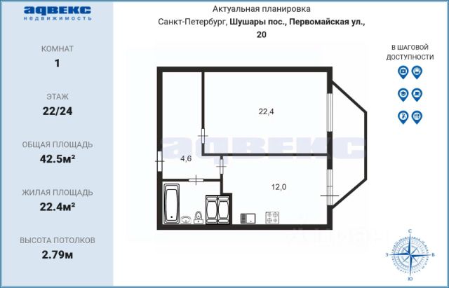 Это район с крайне насыщенной инфраструктурой: рядом торговый центр, магазины, рестораны, Финский залив, парки, пространства "Севкабель" и "Брусницын", а также удобный выезд на ЗСД. До станции метро "Приморская" всего 15 минут пешком.