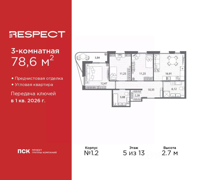 3-комн. квартира с предчистовой отделкой в ЖК "RESPECT" на 2 этаже. Общая площадь: 80.92 кв.м., жилая: 44.24 кв.м., площадь просторной кухни-столовой: 16.53 кв.м. Угловая квартира, идеально подойдет любителям тишины и панорамных видов. В квартире один балкон и две лоджии, один совмещенный и один раздельный санузел. Высота потолков 2.7 м. Квартира будет сдана с отделкой WHITE BOX, в которую включены следующие виды работ: - заливка стяжки; - установлена система отопления квартиры; - подготовлены потолки; - все стены выровнены, загрунтованы и отштукатурены; - электрическая проводка разведена по комнатам. Квартира будет готова к чистовой отделке. Квартира находится в корпусе 6. Дом монолитный, одноподъездный, высотой 13 этажей. На этаже 8 квартир. В подъезде 1 пассажирский и 1 грузовой лифт. Окончание строительства - 4 квартал 2026 года. Оформление сделки по договору долевого участия. В шаговой доступности от жилого комплекса имеются станции метро (расстояние по прямой): "Лесная" (800 м), "Площадь Мужества" (1.4 км), "Выборгская" (1.9 км), также недалеко от этого корпуса расположены станции метро: "Академическая", "Политехническая". Жилой квартал "RESPECT" строится на Полюстровском пр, 87, в одной из самых востребованных локаций Петербурга. В 10 минутах пешком - метро "Лесная" и в 10 минутах на транспорте - Петроградская сторона. Высота домов от 7 до 13 этажей. Квартиры сдаются с отделкой white box и с чистовой отделкой. На территории Respect строится школа на 1125 учащихся и детский сад на 240 мест. Запроектированы собственная газовая котельная, закрытая территория, дворы без машин и подземные паркинги с лифтами. В проекте предусмотрены трапециевидные балконы или остекленные лоджии, которые, с одной стороны, исключают монотонность фасада, являясь декоративными элементами, с другой дополнительным функциональным пространством в квартирах. Цветовая гармония фасадов каждого дома раскрывает характер квартала. Коричневый цвет клинкерного кирпича со структурой водяных штрихов — цвет уюта и безопасности, сдержанности и надёжности. Вентилируемые фасады облицованы клинкерным кирпичом. Его высокая прочность позволяет давать 100 лет гарантии на этот материал. Водопоглощение клинкерного кирпича составляет менее 5%, за счет чего у него высокая теплопроводность и прочность. В квартале запроектированы внутренние закрытые территории дворов домов без доступа автомобилей и безбарьерная среда для велосипедистов и колясок. Предусмотрены IP-домофония с функцией дистанционного открывания калиток и парадных, а также дистанционный сбор показаний счетчиков и мобильное приложение для жителей. Для безопасности жителей квартала - круглосуточное видеонаблюдение и служба охраны. В каждой квартире предусмотрены внешние корзины для кондиционеров. Вся территория квартала будет связана единой концепцией благоустройства, разработанной ландшафтным бюро L.BURO. На эксплуатируемой кровле на уровне первого этажа в домах 1 и 4 будут обустроены общественные видовые те