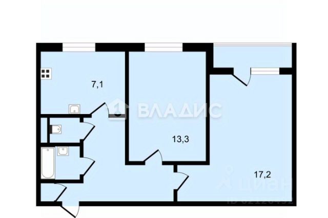 Квартира состоит из 3-х комнат, жилой площадью 42,8 м2, общей площадью 59,6 м2, высота потолков 2,5 м. Санузел раздельный.
