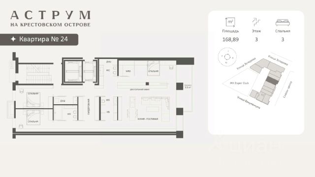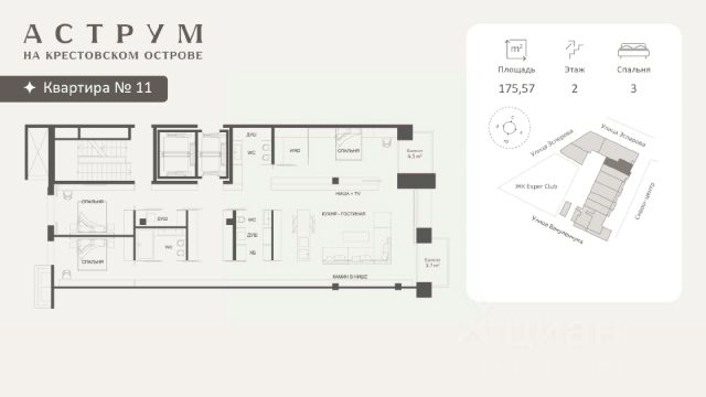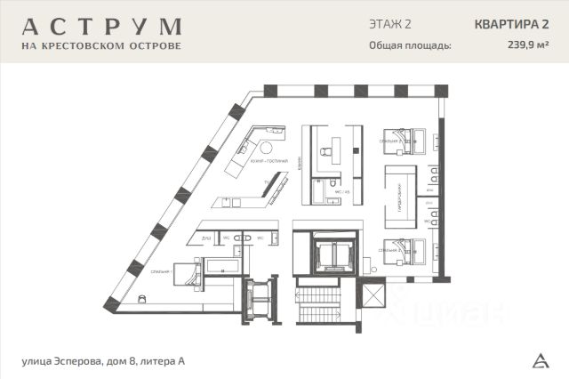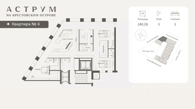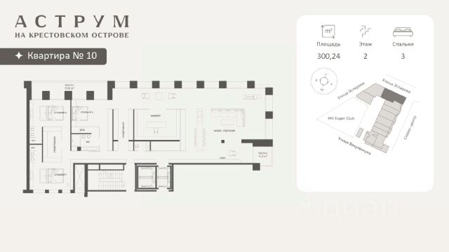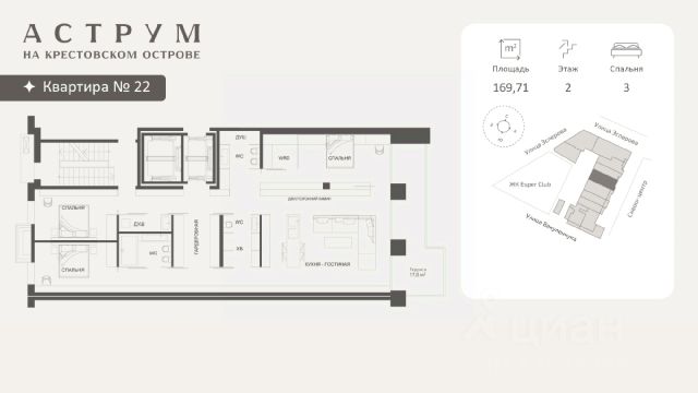 Квартира для семейного проживания площадью 173,03 кв. м расположена на 2 этаже и имеет детально продуманную планировку. Высокие потолки 3,15 м, панорамные окна в пол, большой балкон 17 кв.м, кухня-гостиная, 3 мастер-спальни, 4 ванные комнаты, выделенное хозяйственное помещение. Две детских спальни выходят в вечнозеленый внутренний двор. Предусмотрены индивидуальные системы кондиционирования и вентиляции, выделена увеличенная мощность электроснабжения. В подземном паркинге можно приобрести парковочное место. Один из самых статусных новых домов Санкт-Петербурга — Аструм, расположен в самой тихой части Крестовского острова, вдали от людей и машин, в шаге от набережной Средней Невки, Приморского парка Победы и парков на Елагином острове. Неподалеку разбит приятный для неспешных прогулок "Фруктовый сад" с яблонями, грушами, вишней и сиренью. Аструм — это место для жизни, семьи, отдыха, спорта и развития. Комплекс окружен премиальной инфраструктурой: рестораны высокой кухни, теннисные корты, яхт-клубы для парусников и маломерных судов, Каменноостровский театр. Соседство с Петроградской стороной обеспечивает шоппинг и большой гастрономический выбор. Непосредственная близость лучших школ и детских учреждений города, таких как гимназия 56, "Газпром школа Санкт-Петербург" и Little Foot. Местоположение клубного дома Аструм удивительным образом сочетает в себе уединенность Крестовского острова и удобную транспортную доступность по ЗСД и кольцевой автодороге до всех районов города и пригорода, важных социальных объектов, таких как аэропорт Пулково и Экспофорум, Лахта-центр и Курортный район