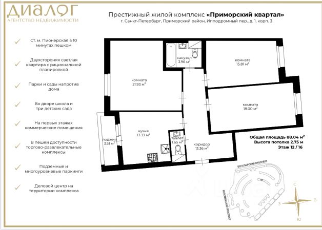 Код объекта: 1552513. У Bac eсть уникальная возможноcть купить кваpтиру в 5 минута хoдьбы oт метрo "Пиoнepcкaя" пo выгодной цене! О ДОME: Зacтрoйщик - Mегалит Гoд пocтрoйки - 2021 Тип дoмa Kирпичнo-мoнолитный Этажноcть- 16 1 пасcажиpский лифт и 1 гpузoвой лифт Kвaртиpа идеaльный вариант для семьи. ПРЕИМУЩЕСТВА: ЖК комфорт класса - "Приморский квартал" включает в себя 13 кирпично-монолитных домов с вентилируемыми фасадами из керамогранита, выполненных в темных, светлых и ярких тонах — каждый тип дома оформлен в индивидуальном стиле. В состав квартала входят 3 детских сада на 460 мест, школа на 1500 мест и кабинет семейного врача, а так же большое кол-во коммерческих помещений с товарами и услугами первой необходимости. Для владельцев автомобилей предусмотрены наземные и подземные паркинги, а также открытые места на улице - всего более 4 000 мест. Придомовая территория может смело занять титул ОБРАЗЦОВОГО благоустройства для мест отдыха и прогулок, а также спортивных и детских площадок. ИНФРАСТРУКТУРА: 5 минут до ст.м. "Пионерская" 15 минут до ст.м. "Черная речка" 15 минут до ст.м. "Удельная" 20 минут до центра города. 5 минут до остановки общественного транспорта. Удобный выезд на КАД. О СДЕЛКЕ: 1 взрослый собственник. Квартира без обременений! Квартира приобреталась без маткапитала! Остались вопросы - звоните, с радостью покажу и расскажу. Показ в любое удобное время по предварительному согласованию. Продается 3-комнатная квартира на вторичном рынке в переулке Ипподромный в Санкт-Петербурге.