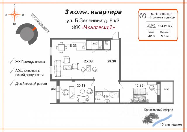 Арт. 106638170 Здравствуйте, уважаемый покупатель! Предлагается к продаже просторная 3-х квартира с дизайнерским ремонтом в современном жилом комплексе, в одной минуте от метро Чкаловская! Дом расположен в историческом центре Петроградского района с развитой инфраструктурой, недалеко от Крестовского острова. Эта светлая уютная квартира располагается на 4 этаже в современном клубном доме бизнес-класса, с красивыми гостевыми холлами, собственной закрытой охраняемой территорией с контролем доступа и подземным паркингом. Дом оборудован системой очистки воды, автономной котельной, современными инженерными и телекоммуникационными системами, во дворе игровая площадка для детей. Общая площадь квартиры 110 метров, с удобной функциональной планировкой, которая включает просторную кухню-гостиную 54 метра, оборудованную бытовой техникой от лучших мировых производителей (Kuppersbusch), кухня- гостиная совмещает в себе комфортную зону отдыха, где можно собираться всей семьей и вместительную кухню с красивой столовой (на кухне есть встроенный винный шкаф), мастер спальню 20,6 м с собственной ванной комнатой 8,8 м, спальню 16 м, вместительную гардеробную 5м , гостевой санузел 4,7м, где установлены современная стиральная и сушильная машины, а также удобные встроенные зоны хранения. Ремонт сделан по индивидуальному дизайн проекту с использованием качественных материалов премиум класса В квартире установлена система кондиционирования Liebherr, теплые полы, домашний кинотеатр, итальянские двери, удобные встроенные зоны хранения. Квартира в собственности более 5 лет, прямая продажа, готовы к быстрой сделке. полное юридическое сопровождение сделки. Звоните, с удовольствием отвечу на вопросы, Ваша квартира ждет Вас!!! 3-комнатная квартира (вторичка) на улице Большая Зеленина в Санкт-Петербурге.