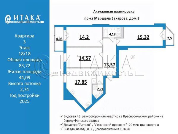Трёхкомнатная квартира в экологически чистом районе Санкт-Петербурга . Предлагается к покупке светлая и просторная трёхкомнатная квартира с качественным ремонтом. Общая площадь — 66,3 кв. м. Эргономичная планировка делает квартиру максимально комфортной для жизни. Основные характеристики: площадь кухни — 7,2 м²; площадь жилых комнат — 13,2 м², 15,4 м², 15,5 м²; есть балкон площадью 3 м², где можно создать релакс-зону или дополнительное место для хранения. В квартире выполнен ремонт из качественных материалов. На кухне — бытовая техника (AEG, ARDO, Indesit). Преимущества квартиры: Окна выходят на юг и юго-запад ,светлая солнечная квартира. удобная планировка; вместительный шкаф-купе в спальне; кухонный гарнитур со встроенной техникой; Инфраструктура: во дворе всегда есть свободные места для парковки; рядом продуктовые магазины, магазины косметики и быта, аптеки, кафе; пункты выдачи OZON и Wildberries; Рядом в локации есть спортивные комплексы с бассейном; гипермаркет "Окей" в 7 минутах езды; взрослая поликлиника в 10 минутах ходьбы, детская — совсем рядом; Квартира находиться в окружение парков "Южно-Приморский парк" — 10 минут езды. Стрельна - в 10 минутах езды . Отличная локация: Во дворе детские сады, частная школа экономики и права , детская поликлиника 74, через дорогу известный лицей 369. Удобный выезд на КАД и ЗСД. До метро "Проспект Ветеранов", "Автово" и "Ленинский проспект" — 15 минут на транспорте. В конце 2025 года планируется открытие станции метро "Юго-западная" - 10 минут пешком . Все документы готовы к сделке. Звоните и записывайтесь на показ! Арт. 116853871 3-комнатная квартира (вторичка) на улице Маршала Захарова в Санкт-Петербурге.