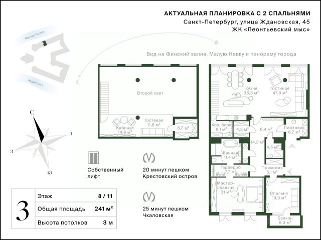 К продаже предлагается изысканная квартира площадью 109 кв. м с двумя спальнями, 3 санузлами и просторной кухней-гостиной, оформленной с безупречным вкусом. Высококачественный ремонт дополнен продвинутой инженерией: приточно-вытяжная вентиляция, индивидуальное кондиционирование в каждой комнате, многоступенчатая система очистки воды. Мастер-спальня с элегантной гардеробной и роскошным санузлом открывает вид на благоустроенный внутренний двор. Окна детской или кабинета обращены к живописной реке Ждановка. Дом отличается исключительными характеристиками: панорамные окна премиум-класса Reynaers Aluminium, потолки высотой 3,1 м, индивидуальная вентиляционная система, трехступенчатая очистка воды, тепловой пункт в каждой квартире, бесшумные лифты Kone с доступом из подземного паркинга, безопасная детская игровая комната с видеонаблюдением, а также зоны для хранения велосипедов и колясок. "Леонтьевский Мыс" воплощение роскоши и комфорта в уникальной локации, всего в 5 минутах ходьбы от Крестовского острова, на мысу, окруженном реками Ждановка и Малая Невка, в 8 минутах от Невского проспекта. Живописное расположение сочетает панорамные виды, чистый воздух и уединение, редкое для центра Петербурга. 600 метров благоустроенной набережной с променадом созданы для прогулок и спорта. Проект разработан петербургскими архитекторами совместно со всемирно известной студией Yoo, гармонично соединяя современные тренды, передовые инженерные решения и адаптацию к климату города. Инфраструктура комплекса продумана до мелочей: консьерж-сервис, многоуровневая охрана, круглосуточный диспетчер, уютный внутренний двор с плетеной мебелью, международный детский сад, школы, развивающие центры, салон красоты, дизайнерские лобби с бильярдом, переговорной и игровой комнатами, трехуровневый паркинг на 700+ мест, а также рестораны и кафе с доставкой еды в квартиры. Купить 3-комнатную квартиру (вторичка) на улице Ждановская в Санкт-Петербурге.