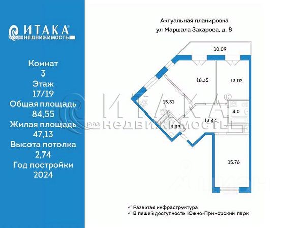 118733613 Просторная трёхкомнатная квартира с двумя санузлами и видом на Дудергофский канал. Расположена на 17 этаже, общей площадью 84,55 кв.м. Уютная кухня-гостиная 15,31 кв.м. станет центром семейной жизни, где можно собираться с близкими или принимать гостей. Просторные комнаты 18,35, 13,02 и 15,76 кв.м. обеспечивают комфорт для каждого члена семьи — здесь легко разместить спальню, детскую и кабинет. Два санузла (4,00 и 3,39 кв.м.) делают планировку максимально удобной. Большая прихожая 14,62 кв.м. позволяет организовать зону хранения без потери пространства. Из двух комнат есть выход на впечатляюще просторный балкон 10,09 кв.м. — отличное место для отдыха с видом на город. Окно одной из комнат выходит на Дудергофский канал, а кухни и других помещений — во двор, что создаёт идеальный баланс между панорамным видом и тишиной.Квартира полностью готова к проживанию — с качественной чистовой отделкой: обои под покраску, керамическая плитка в санузле, белые межкомнатные двери, современная сантехника. Из окон открывается приятный вид на Дудергофский канал — тишина, простор и ощущение уюта.Дом построен по современной монолитной технологии с вентилируемыми фасадами из керамогранита и витражным остеклением балконов. На этаже — всего 5 квартир, что обеспечивает комфорт и приватность. Для вашего удобства установлены малошумные лифты импортного производства, которые спускаются прямо к уровню подземного паркинга.Локация продумана до мелочей: всего 7 км до КАД, 14 км до аэропорта "Пулково" и около 15 минут до станций метро "Ленинский проспект", "Автово" и "Кировский завод". А уже в 2025 году поблизости откроется новая станция метро "Юго-Западная" — ещё один весомый плюс для жизни и инвестиций.Продажа осуществляется напрямую по договору купли-продажи. Объект аккредитован всеми ведущими банками, возможна покупка с использованием льготной ипотеки, субсидий и жилищных сертификатов.Данный жилой квартал — это масштабный современный проект в несколько очередей. Первая и вторая очереди уже сданы и заселены, жители ценят удобство, развитую инфраструктуру и ухоженные дворы.На территории комплекса — всё для комфортной жизни: две школы с бассейнами и спорткомплексом (одна уже работает, вторая готовится к открытию), пять детских садов, поликлиника, магазины, уютные кафе и подземные паркинги. Для прогулок и отдыха — благоустроенные дворы, велодорожка вокруг квартала и современный городской пляж на берегу залива. Итака. 30 лет на рынке. 3-комнатная квартира (вторичный рынок) в Санкт-Петербурге.