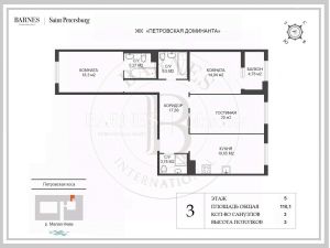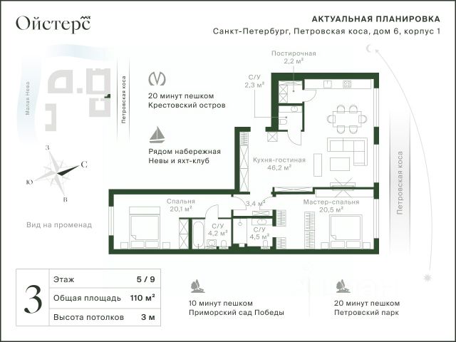 Квартира имеет функциональную планировку: просторная кухня-гостиная, 2 спальни, вместительные гардеробные и другие системы хранения.