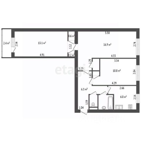 19,4 кв м - c выходом на балкон - 5.8 кв. м