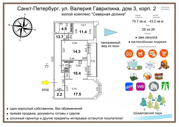 Арт. 116068278 Продается просторная 3-х комнатная квартира на центральной улице м. Парнас. Федора Абрамова 23/1.Общая площадь квартиры — 84,8 кв. м, расположена на 16-м этаже 27-этажного дома. На этаже всего 6 квартир. Планировка включает в себя: -3 изолированные правильной формы комнаты 14,6 + 12,2 + 16,6 кв. м, -кухня площадью 10,3 кв. м, -совмещенный санузел 5,1 кв. м, -отдельный санузел 3.8 кв. м, -гардеробная/кладовая 5,8 кв. м, -просторная прихожая 6 кв. м, -коридор 7 кв. м, -лоджия 3,1 кв. м. окна выходят как на улицу, так и во двор. Важно! -Один взрослый собственник. - Квартира не сдавалась. -Квартира без обременений. -Мат. капитал не использовался. -Доли не выделялись. -Никто не был прописан. -Ни каких обременений. -Перепланировки отсутствуют. -Полная стоимость в договоре. -Прямая продажа. -Прихожая отделена от центра квартиры (не нужно постоянно ходить по уличному коврику). -Большая гардеробная/кладовая 5,8 кв. м. Квартира требует ремонта, так как ремонт от застройщика уже пришёл в негодность. Зато есть возможность сделать ремонт на свой вкус. Создать уютное гнездышко, для своей семьи. Дом оборудован двумя пассажирскими и одним грузовым лифтом, просторная лифтовая и хол дома. Выход на 2 стороны. Наземная парковка обеспечит вас местом для автомобиля. Остановки в 3-5 минут пешком. Вблизи дома находятся 2 школы, 2 детских сада, магазины, кафе, рестораны, аптеки , детские и спортивные площадки, что делает его отличным местом для семей с детьми. В пешей доступности взрослая и детская поликлиника, Шуваловский парк для прогулок, Церковь. Звоните прямо сейчас и записывайтесь на просмотр. Быстрая и безопасная сделка гарантирована. Продается 3-комнатная квартира на вторичном рынке в Санкт-Петербурге.