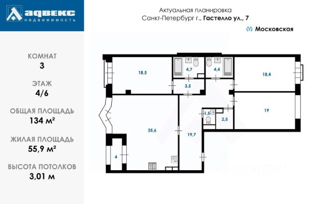 Продаётся 3-комнатная квартира в сданном доме (Московский, 183-185Ак8), срок сдачи: II-кв. 2020, общей площадью 150.6 кв.м., на 4 этаже. Расположение, транспортная доступность
