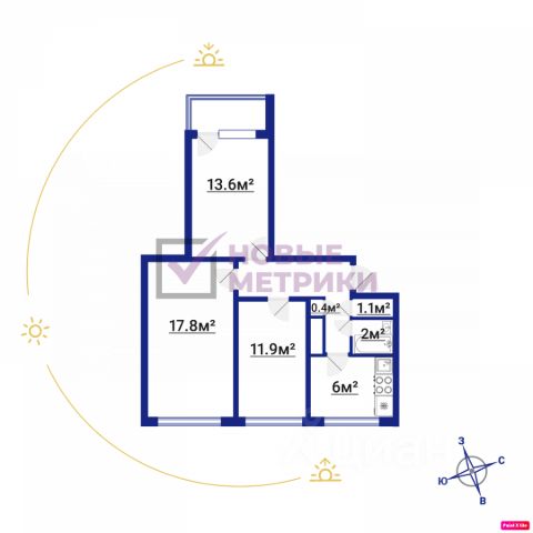 Комнаты 23м, 17м, 16м, кухня 13 м, коридор 21м, санузлы 2 и 8м, лоджия 3м.
