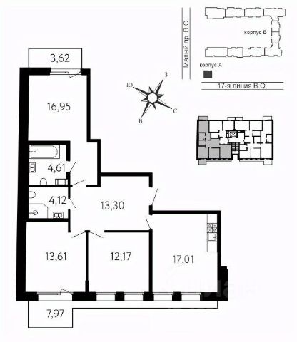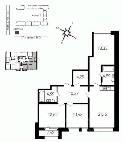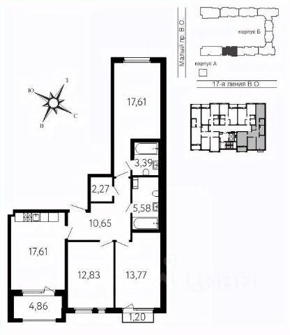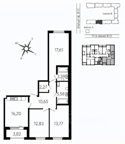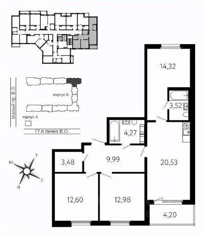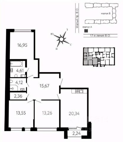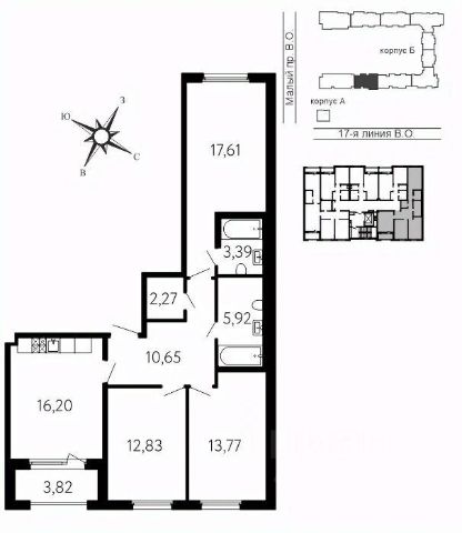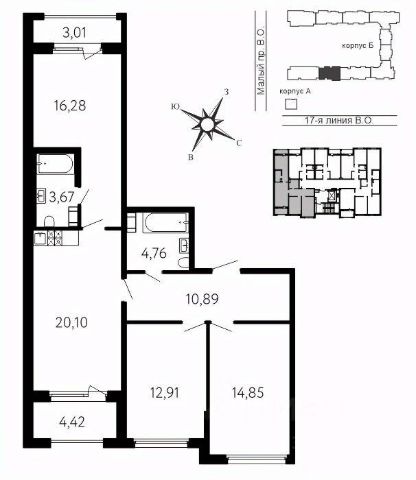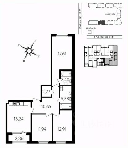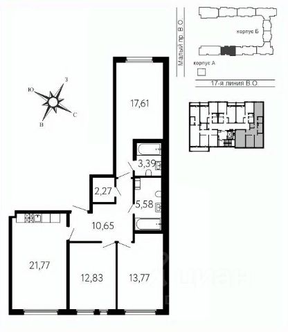 Квартира расположена на 3 этаже, общая площадь 85.17 м2, а высота потолков 2.76 м. В ней очень продуманная и грамотная планировка: помещения кухни и двух комнат выходят окнами в сторону набережной Малой Невы, а третья комната в тихий двор. Также есть два санузла, две лоджии и хозяйственная комната.