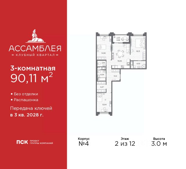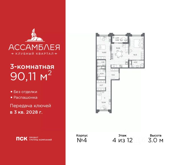 3-комн. квартира в Клубный квартал "Ассамблея" на 4 этаже. Квартира без отделки, новый владелец может сделать ремонт по индивидуальному проекту. Общая площадь: 105.08 кв.м., жилая: 49.33 кв.м., площадь просторной кухни-столовой: 24.02 кв.м. Квартира - распашонка, без проходных комнат, окна выходят на paзные стороны дома. В квартире одна лоджия, два совмещенных и один раздельный санузел. Высота потолков 3.0 м. Дом монолитный, черырехподъездный, высотой 12 этажей. Квартира находится в 4-й секции в корпусе 5. На этаже 10 квартир. В подъезде 1 пассажирский и 1 грузовой лифт. Окончание строительства - 3 квартал 2028 года. Оформление сделки по договору долевого участия. В шаговой доступности от жилого комплекса имеются станции метро (расстояние по прямой): "Горный институт" (1.0 км), "Василеостровская" (1.4 км), "Приморская" (1.5 км), также недалеко от этого корпуса расположены станции метро: "Спортивная", "Чкаловская". "Клубный квартал Ассамблея" — проект бизнес-класса на Васильевском острове, в самом сердце исторического Петербурга. Комплекс состоит из пяти корпусов переменной этажности — от 7 до 12 этажей — с выразительной архитектурой в стиле неомодернизма: светлый клинкер, панорамное остекление, просторное лобби с потолками высотой почти 8 метров. Потолки — до 3,2 метров. Подземный паркинг на 667 машиномест. Комфорт и инфраструктура Проект ориентирован на комфортную городскую жизнь. В закрытом дворе — ландшафтное озеленение, современные детские и спортивные площадки. Внутренний клуб для резидентов включает коворкинг, переговорные, кинозал, фитнес и бьюти-зону. IP-домофония с просмотром камер видеонаблюдения, дистанционное открывание дверей и доступа на территорию и в парадную со смартфона и планшета, просмотр показаний счетчиков, приложение для жителей PSK Home. Локация Расположение на Васильевском острове — сильная сторона проекта. До четырех станций метро ("Горный институт", "Василеостровская", "Спортивная", "Приморская") — 515 минут пешком. В шаговой доступности — зелёные зоны, культурные учреждения, в том числе сад "Василеостровец" и ДК имени Кирова. Основные магистрали Большой, Средний и Малый проспекты, Наличная и Уральская улицы. Съезд на ЗСД расположен недалеко от станции метро "Приморская", близ береговой линии. Благовещенский и Дворцовый мосты соединяют остров с центром города, а мосты Тучков, Биржевой и Бетанкура — с Петроградской стороной. Застройщик Группа компаний ПСК является одной из ведущих девелоперских компаний Санкт Петербурга. На протяжении 18 лет она возводит в Северной столице качественное жилье премиум, бизнес и комфорт-класса, социальные объекты школы и детские сады, апарт-отели и торговые центры. Является шестикратным обладателем золотого знака "Надежный застройщик России". #ZmBgEA