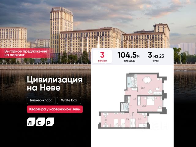Выгодное предложение на паркинг. Продаётся 3-комнатная квартира в ЖК "Цивилизация на Неве" на 3 этаже. Общая площадь составляет 85.00 кв. м. Квартира с white box отделкой. Жилой комплекс "Цивилизация на Неве" располагается по адресу Санкт-Петербург, Невский. "Цивилизация на Неве" - видовые дома бизнес-класса, расположенные вдоль набережной Невы, всего в 7 км от исторического центра. Жилой комплекс идеально выражает особый дух, свойственный знаменитым просторным кварталам постройки сталинской эпохи в Москве и на Московском проспекте в Петербурге. Расположение: • 15 мин на авто до Невского проспекта; • 15 мин на авто до Московского вокзала; • 5 мин на авто до станции метро "Улица Дыбенко"; • 14 мин (7 км) до КАД. Уникальный дизайн входных зон, закрытая территория, видеонаблюдение и охрана, подземный паркинг с лифтом и другие особенности проекта отвечают заявленному классу. В каждом дворе предусмотрено озеленение по индивидуальному ландшафтному проекту с благородными растениями и кустарниками. Преимущества: • Закрытая территория с видеонаблюдением; • Подземный паркинг с лифтом; • Детская площадка на приватной безопасной территории; • Несколько детских садов и школ; • Инфраструктура шаговой доступности на первых этажах корпусов. Успейте приобрести квартиру на выгодных условиях! Чтобы узнать подробности, обращайтесь за консультацией по телефону. Продается 3-комнатная квартира в ЖК Цивилизация на Неве в Санкт-Петербурге.