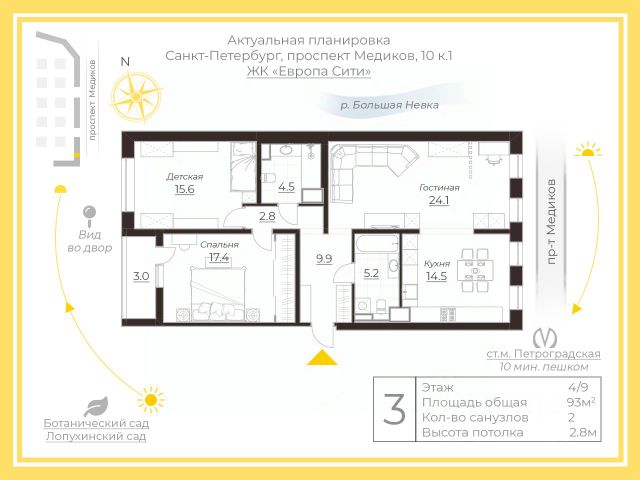 В квартире сделан современный ремонт, есть вся необходимая мебель и техника. Три просторных комнаты (29,0 кв.м., 19,3 кв.м. и 19,4 кв.м.), кухня с обеденной зоной (24,2 кв.м.), два санузла и лоджия 7,1 кв. м. Потолки - 3 метра. Большая часть окон выходят на Малую Невку. Квартира расположена на комфортном 2-м этаже. Удобная планировка включает один совмещенный и один отдельный санузел, что особенно удобно для семей с детьми или для гостей. Из окон квартиры открывается вид как на двор, так и на улицу, а на балконе можно наслаждаться свежим воздухом в видом на р. Малую Невку и зелень.