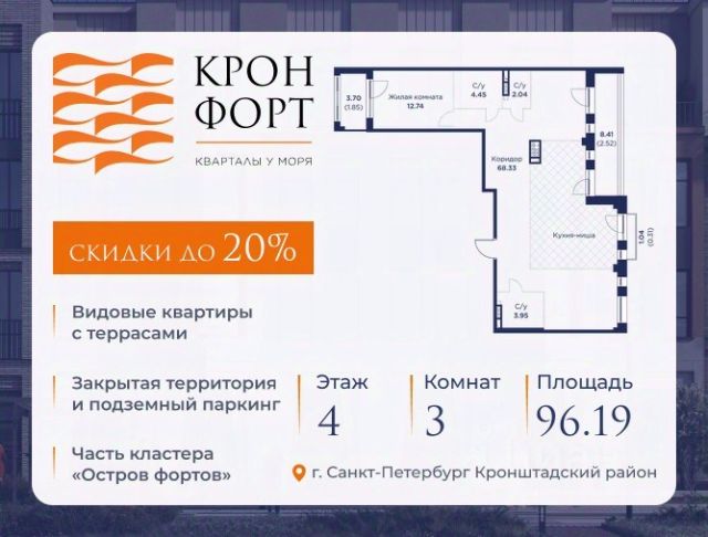 Стоимость квартиры указана со скидкой 20%. Скидка предоставляется при 100% оплате или несубсидированной ипотеке. Предлагается квартира площадью 79.41 кв.м в жилом комплексе "Кронфорт. Центральный" в Санкт-Петербурге (Кронштадт). Возможна покупка с использованием льготных и специальных ипотечных программ с государственной поддержкой. Высота потолков в квартирах — от 3 до 3,4 метров, окна увеличенного размера, есть варианты с эркерами, французскими балконами, лоджиями и террасами. Жилой квартал состоит из пяти четырехэтажных корпусов с закрытыми охраняемыми дворами, свободными от машин. Первые этажи формируют торговые променады в стиле пешеходных улиц исторической части Петербурга и Кронштадта. Внутренние пространства между корпусами — пешеходные зоны с уютными площадями. Архитектурный облик квартала разработан бюро "Проектная культура" и международной компанией Chapman Taylor. Инфраструктура комплекса включает: - Лицей с двумя бассейнами - Детский сад на 150 мест с бассейном и закрытой территорией - Веревочный парк - Игровые площадки для активного отдыха; - Кабинет врача общей практики. - Подземные паркинги с лифтами. - Мусоросборные камеры, индивидуальные кладовые. - Закрытые дворы с контролем доступа и видеонаблюдением. - Мультформатный стрит-ретейл с кафе и ресторанами. - Триатлон-центр и беговые/велодорожки. - Учебно-тренировочный комплекс для детей "Лагерь настоящих героев". Транспортная доступность обеспечивает удобный выезд на КАД (около 1-3 км), 2 минуты пешком до автобусной остановки "Лицей", 25 минут до Сестрорецка, 30 минут до "Лахта-центра", 50 минут до аэропорта "Пулково" и 60 минут до Московского вокзала. Для любителей моря доступен маршрут на "Метеоре" до центра Санкт-Петербурга. Отделка квартир предлагается как с готовой чистовой отделкой, так и со свободной планировкой без отделки для реализации индивидуальных дизайнерских решений. В третьем корпусе, продажи которого стартовали в марте 2025 года, доступны квартиры с просторными террасами, тремя балконами, кухнями-гостиными до 38 кв.м с окнами на две стороны, обеспечивающими панорамное освещение и виды. Если вам нужна помощь с оформлением ипотеки или дополнительная информация по комплексу и условиям покупки, обращайтесь в отдел продаж за консультацией.