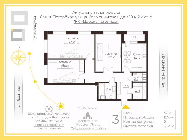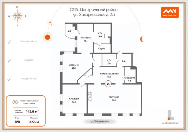 Клубный дом "МИРЪ" в самом центре Петербурга — воплощение идеальной картины мира для истинных ценителей прекрасного. Дом строится на Миргородской улице, в двух шагах от Невского проспекта и Московского вокзала. Из окон квартир приятно созерцать красоту Феодоровского собора и вдохновляться захватывающей панорамой Петербурга. В шаговой доступности — метро "Площадь Восстания", крупные торговые центры и "Старо-Невский" проспект с бутиками мировых премиум-брендов. Утром достаточно выйти из парадной, чтобы через 5 минут расположиться в кресле "Сапсана" и с комфортом добраться до Москвы. Путь до КАД и ЗСД на автомобиле займёт не более 15 минут, до аэропорта "Пулково" — полчаса. Камерная атмосфера создаётся за счёт деления на два корпуса и небольшого количества квартир в доме — их всего 263. Корпуса объединены триумфальной аркой, которая формирует закрытый контур внутреннего двора. Статус дома подчеркивают парадные холлы с арочными пролётами, витражным остеклением и произведениями искусства. Автомобилисты смогут спуститься в подземный паркинг на лифте прямо со своего этажа. Гостевую стоянку организуют вне комплекса — чтобы не нарушать безопасность двора. Для жителей в доме появится приватный фитнес-зал. Также в большом корпусе появится муниципальный детский сад с собственной игровой площадкой за пределами камерного пространства дома. В каждой парадной — просторные колясочные. Велосипеды вы сможете оставить на оборудованных велопарковках. Во внутреннем дворе появится живописный сквер, а в центре появится своеобразная "зелёная комната" с воздушным навесом и обогревателями. Детские игровые зоны воплощают природные формы и выполнены из экологичных материалов. В южной части двора расположится амфитеатр с отделкой из натурального дерева. Свободный Wi-Fi позволит подключиться к работе онлайн прямо во дворе или из парадных холлов. Территория дома полностью огорожена и охраняется круглосуточно. Войти в парадные можно только со стороны внутреннего двора по бесконтактному электронному ключу. Спланировать встречу гостей легко и удобно через специальное приложение для жителей. Площадь квартир варьируется от 26 до 146 м². Планировки с просторными кухнями-гостиными, мастер-спальнями, которые предусматривают отдельный санузел и выделенную гардеробную. А квартиры на верхних этажах дома с трёхметровыми потолками, панорамными окнами и видовыми террасами, откуда обозревается исторический центр города.