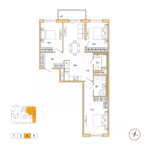 Срочно продаётся 4Е-квартира с тремя спальнями общей площадью 84.6 м2. в Приморском районе Санкт-Петербурга. Квартира расположена в монолитном доме комфорт-класса. Идеальное место для комфортной жизни в окружении лесных массивов. О квартире: - Квартира находится на 3 этаже 7-этажного дома - Общая площадь квартиры 84.6 м2 - Светлая спальня 17.0 м2 с отдельным санузлом 4.1 м2 - Детские комнаты 10.4 и 10.7 м2 - Просторная кухня-гостиная 20.0 м2 - Совмещённый санузел 3.2 м2 - Застекленный балкон 4.2 м2 PRO дом и район: - Дворы закрыты от проезда машин, для автовладельцев предусмотрены 4 отдельно стоящих паркинга и 6 пристроенных. - Комплекс находится в окружении 3 лесных массивов: Суздальские озера, Шуваловский парк и Юнтоловский заказник - В состав комплекса входит 3 детских сада на 140 мест и школа на 825 мест. - В 10-15 минутах езды находятся сразу 3 станции метро: Парнас, Проспект Просвещения и Озерки - Рядом с комплексом находятся удобные выезды на КАД, Выборгское шоссе, Суздальский проспект и Парашютную улицу - до центра города около 40 минут Прямая продажа, один правообладатель. Не упустите свой шанс! Квартира в наличии, звоните прямо сейчас!