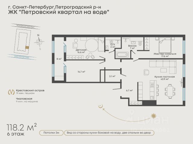Арт. 113594560 Уважаемый Покупатель! Представляем просторную квартиру 3- Евро с новым ремонтом в престижном комплексе "Петровский квартал на воде" в пешей доступности от м. Крестовский остров. В квартире функциональная планировка: Большая светлая кухня-гостиная 32 м с панорамным видом на зелень. 2 спальни ( 2 спальни удачно расположены на разные стороны света, одна из которых выходит в тихий переулок ) 3 гардеробные 2 санузла уютная лоджия В квартире выполнен новый ремонт с использованием дорогостоящих материалов и техники, в квартире панорамные окна, что добавляет света пространства, а также высокие потолки, установлены бризеры. О доме: Стильный дом со своим сквером и выходом на набережную Малой Невки. Круглосуточная охрана, видеонаблюдение, консьерж-сервис. Многоступенчатая система очистки воды. Подземный паркинг. Сейчас Петровский остров-новый, уютный квартал с однородной средой жильцов и развитой инфраструктурой. Лучшие парки в пешей доступности. Исторический и деловой центр в 15 минутах на автомобиле. На острове есть 5 муниципальных детских садов, современная муниципальная школа с двумя бассейнами. Действует новая сцена театра ЛДМ. Кофейни, магазины, винные бутики, салоны красоты и все необходимое для комфортной жизни семьи не выезжая из острова. Удобный выезд на ВО и ЗСД. Звоните прямо сейчас и приходите на просмотр! Полное юридическое сопровождение сделки Продается 3-комнатная квартира 3-комнатных квартир в Петровский квартал на воде в Санкт-Петербурге.