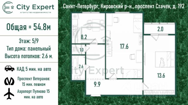 Продается классная 2к квартира в отличном камерном доме. Требуется косметический ремонт. Микрорайон с богатой инфраструктурой. Рядом множество парков и скверов, усадьба Александрино в 20 минутах пешком. Удобно добираться до Петергофа. В пешей доступности вся социальная инфраструктура - школы, в том числе школа олимпийского резерва Кировского района, садики, поликлиники, магазины и кафе. Во дворе стадион, рядом спортивная и детская площадки, место для прогулок вдоль набережной. В пешей доступности две станции метро (красная ветка) - Проспект Ветеранов и Ленинский проспект. Выезд на КАД в 5 минутах. До центра города 30 минут на автомобиле. Один взрослый собственник. Без обременений. Никто не прописан. Записывайтесь на просмотр!)