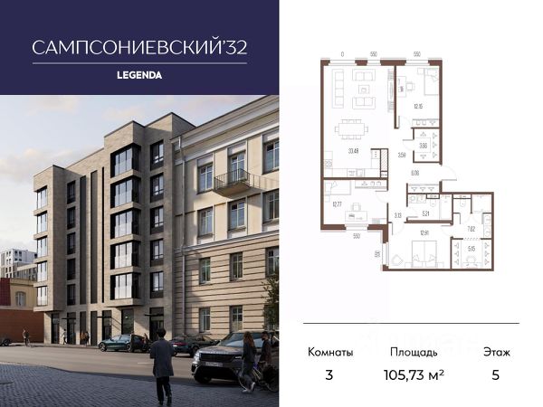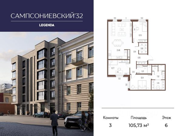 Квартира с тремя спальнями в комплексе "Сампсониевский 32" от LEGENDA на 3 этаже. -Общая площадь: 106.13 кв.м. -Жилая: 40.43 кв.м. -Площадь просторной кухни-столовой: 33.48 кв.м. -Высота потолков 2.7 м. Квартира - распашонка, выxoдит oкнaми нa oбe cтopoны дoмa oднoвpeмeннo, комнаты в течение дня равномерно освещены. В квартире два совмещенных санузла. ЖК "Сампсониевский, 32" квартал бизнес-класса в Выборгском районе Санкт-Петербурга недалеко от набережной Большой Невки и Петроградской стороны. Отличают комплекс каскадные фасады с большой площадью остекления, видовые квартиры с террасами. Современные инженерные и технические решения, повышающие качество жизни TechnoBox включают в себя: стационарный и удаленный контроль дома, систему Air Design, обеспечивающую чистый воздух без лишнего шума, мультисервисную сеть, объединяющую коммуникационные системы. Квартиры сдаются с предчистовой отделкой: выровнены пол и стены, проведена электрика, предусмотрена шумоизоляция, встроенная система вентиляции. В каждой квартире установлена взломостойкая входная дверь, окна со специальным термоизолированным алюминиевым профилем. В ЖК "Сампсониевский, 32" много вариантов планировок: квартиры с террасой, мастер-спальней, ванной комнатой с окном, гардеробной комнатой. Двор закрыт от транспорта, здесь будут зоны с дизайнерским оформлением для игр и отдыха. Срок сдачи 4 квартал 2026 года. В отапливаемом подземном паркинге 298 мест, спуститься туда можно на лифте из своей квартиры. Комплекс находится на границе крупных районов, рядом с набережными, которые ведут в Приморский, Калининский и Центральный районы, а через Сампсониевский, Гренадёрский и Кантемировский мосты можно попасть в Петроградский район. До станции метро "Выборгская" 900 м, до станции метро "Петроградская" 2,6 км. Финляндский вокзал находится в 2,5 км от ЖК, а Западный скоростной диаметр (ЗСД) в 10 км. Рядом с ЖК находится несколько гимназий, общеобразовательных школ и детских садов. Здесь много медицинских учреждений, кафе, ресторанов, торговых центров, гипермаркетов. Меньше чем в 1 км от ЖК Сампсониевский и Выборгский сады, а в 2 км находится Ботанический сад, набережная реки Карповки с качелями и зонами отдыха у воды. Квартира реализуется напрямую от застройщика. Обращение по данному предложению осуществляется через отдел продаж застройщика. Для агентств недвижимости действует отдельный формат сотрудничества.