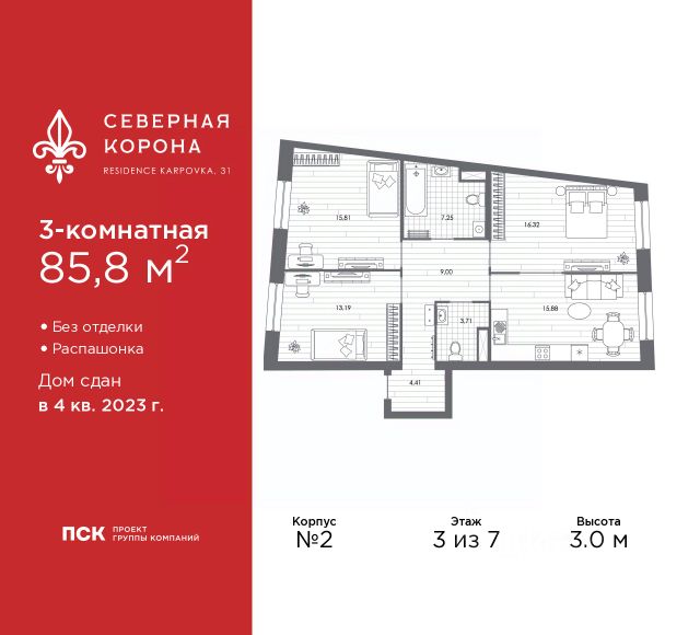 Продаются 3-комн. апартаменты в ЖК "Северная корона" на 2 этаже. Апартаменты без отделки, после оформления собственности можно делать ремонт. Общая площадь: 101.7 кв.м., жилая: 62.8 кв.м., площадь просторной кухни-столовой: 20.8 кв.м. Квартира без проходных комнат, окна выходят нa три cтopoны дома. В апартаментах один совмещенный и один раздельный санузел. Высота потолков 3.3 м. 3 корпус дома "Северная Корона" представляет собой реконструкцию исторического здания доходного дома М.К. Покотиловой. Доходный дом строился в неоклассическом стиле с рустированными пилястрами, балюстрадой, барельефами в виде путти, ваз и сатиров, а также маскаронами львов в замковых камнях арок первого этажа. Основное здание было четырехэтажным, а боковые крылья трехэтажными. Данное решение ступенчатой композиции было продиктовано близостью Карповского переулка более высокую часть архитектор увел вглубь участка. Конструкция здания производилась согласно канонам неоклассической архитектуры: массивные стены достигают толщины в 1 метр, а высота потолков доходит до 3,4 метра. Кроме того, на первом и втором этажах выполнены сложные окна двойные и тройные. Они состоят из двух и трех оконных проемов, которые объединены общими декоративными элементами в виде барельефов. Апартаменты находятся в корпусе 3. Дом монолитно-блочный, одноподъездный, высотой 7 этажей. На этаже 4 квартиры. В подъезде 3 грузовых лифта. В настоящее время строительство окончено, дом сдан в 4 квартале 2023 года. Оформление сделки по договору купли-продажи. В шаговой доступности от жилого комплекса расположены станции метро (расстояние по прямой): "Петроградская" (500 м), "Чкаловская" (1.3 км), "Горьковская" (1.7 км), "Чёрная речка" (1.7 км), также недалеко от этого корпуса находятся станции метро: "Чернышевская", "Спортивная". Премиальный жилой комплекс "Северная корона" расположился в парадной части Петроградской стороны на пересечении ее главного проспекта — Каменноостровского и набережной реки Карповки. Двухсотметровое парадное лобби, дизайнерский ландшафт, собственная фитнес-студия, парадная гостиная для встреч и переговоров, игровой клуб для детей. А также: системы очистки и подготовки воды и воздуха, консьерж-сервис, бесключевой доступ, помещения для ожидания и многое другое. Архитектура премиального дома "Северная корона" — это современное воплощение и новое развитие архитектуры северного модерна. Особенность и уникальность дома в его протяженности вдоль реки Карповки. Фасад исключает монотонность, линии интегрированы в канву курдонера и внутренних общественных пространств, обращённых как в сторону Каменноостровского проспекта, так и Иоановского монастыря. Все квартиры в полной мере можно назвать видовыми они открыты историческому окружению и ландшафтной архитектуре. Что дарит владельцам единственные в своем роде захватывающие виды. Этажность: 4 - 9 этажей (в т.ч. 1 подземный) Дом СДАН. Класс проекта: Премиум класс Уникальность проекта: - Французские балконы - Видовые кварт