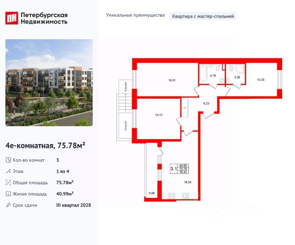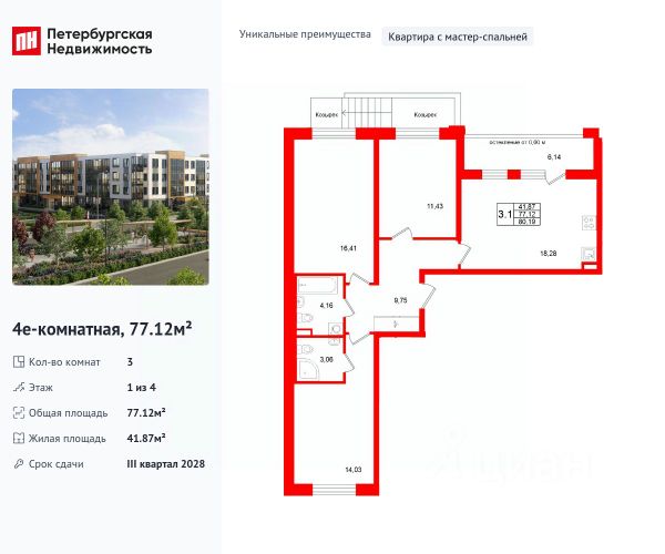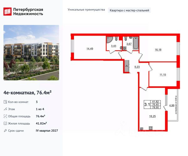 Продается уютная, семейная 3-комнатная квартира от застройщика в жилом комплексе "Univer City" в на юге Санкт-Петербурга. До метро можно добраться на транспорте всего за 30 минут. Мастер-спальня с собственной ванной комнатой. Самое приватное пространство в вашей квартире. Уникальная, функциональная европланировка, большая кухня-гостиная 18.25 м², вместительная прихожая 9.23 м². Общая площадь квартиры - 76.4 м², жилая 41.82 м², высота потолка 2.77 м. Квартира продается с отделкой "Норд Лайн светлый". Что особенного в ЖК "Univer City"? • Малоэтажное строительство • Скандинавские фасады с отделкой керамогранитом, акцентные входные группы • Закрытые внутренние дворы без машин • Пешеходный променад с тематическими зонами, еловый сквер и яблоневый сад • Univer Park, включая SetlSport и SetlKids, площадку для выгула собак и зоны отдыха • Инновационный Лицей Setl с оригинальной архитектурной концепцией и уникальной образовательной средой