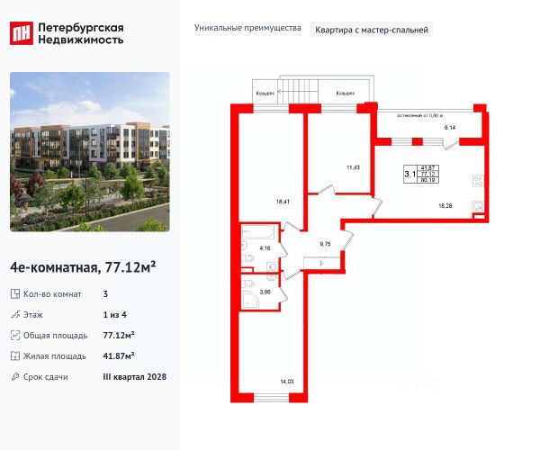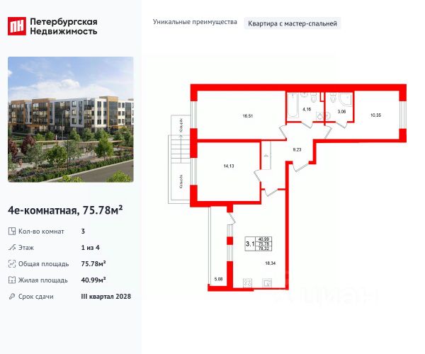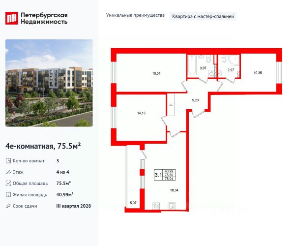 Продается уютная, семейная 3-комнатная квартира от застройщика в жилом комплексе "Универ Сити" в на юге Санкт-Петербурга. До метро можно добраться на транспорте всего за 30 минут. Мастер-спальня с собственной ванной комнатой. Самое приватное пространство в вашей квартире. Уникальная, функциональная европланировка, большая кухня-гостиная 18.34 м², вместительная прихожая 9.23 м². Общая площадь квартиры - 75.69 м², жилая 40.99 м², высота потолка 2.77 м. Квартира продается с отделкой "Норд Лайн серый". Что особенного в ЖК "Универ Сити"? • Малоэтажное строительство • Скандинавские фасады с отделкой керамогранитом, акцентные входные группы • Закрытые внутренние дворы без машин • Пешеходный променад с тематическими зонами, еловый сквер и яблоневый сад • Инновационный Лицей Setl с оригинальной архитектурной концепцией и уникальной образовательной средой • Универ Парк, включая SetlSport и SetlKids, площадку для выгула собак и зоны отдыха