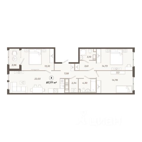 Три изолированных жилых комнаты 13.5+13.5+12.5 со вторым светом