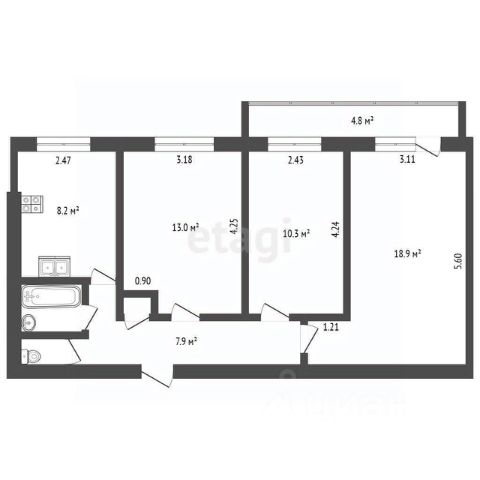 Комнаты: две изолированные и одна смежная (18.5 / 17.2 / 13.8 м²)
