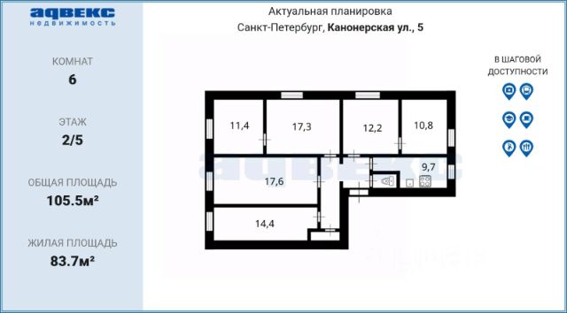 Пять комнат, потолки комфортной высоты 2,6 м, два входа: парадный и чёрный. Есть и балкон, что редкость для таких домов. Окна выходят как на Вознесенский проспект, так и во двор. Ориентированы на восток. Оригинальные рамы, паркет и межкомнатные двери создают ту самую петербургскую атмосферу. Квартира требует ремонта и это шанс воплотить любые идеи для жизни, работы или инвестиций.