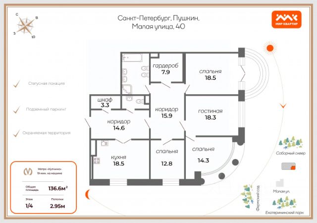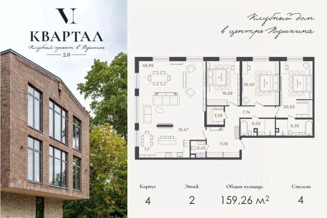 Предлагается к продаже семейная резиденция площадью 159,26 кв.м. Квартира строго зонирована на приватную и гостевую часть: кухня-столовая площадью 16,47 кв.м объеденяется с роскошной гостиной площадью 49,89 кв.м с четырьмя панорамными окнами ориентированными на две стороны. Приватная часть включает в себя три спальни, две ванные комнаты, две гардеробные и постирочную. Высота потолка 3м, большие окна, возможно приобретение машиноместа и дополнительной кладовки в подземном паркинге. "VI Квартал" клубный проект, состоящий из четырех трехэтажных корпусов, рассчитан на 76 квартир и 98 машиномест в подземном паркинге. "VI Квартал" расположен в городе Пушкин, на ул. Новая, 20, в шаговой доступности от Екатерининского дворца. Комплекс предусматривает квартиры от 54 до 160 м2 с просторными планировками от 1 до 3 спален, с панорамными окнами и высокими потолками от 3 до 3,8 м. Особое место в проекте занимает детский сад с бассейном на 105 мест для детей от 3-х до 7-ми лет. На территории детского сада запроектированы игровые зоны, физкультурные площадки с резиновым покрытием, зеленые насаждения и теневые навесы. На территории самого комплекса предусмотрены прогулочные зоны, детские и игровые площадки. Безопасность обеспечивает закрытая территория, пункт охраны, консьерж-сервис. Продается 4-комнатная квартира элитные в Пушкине.