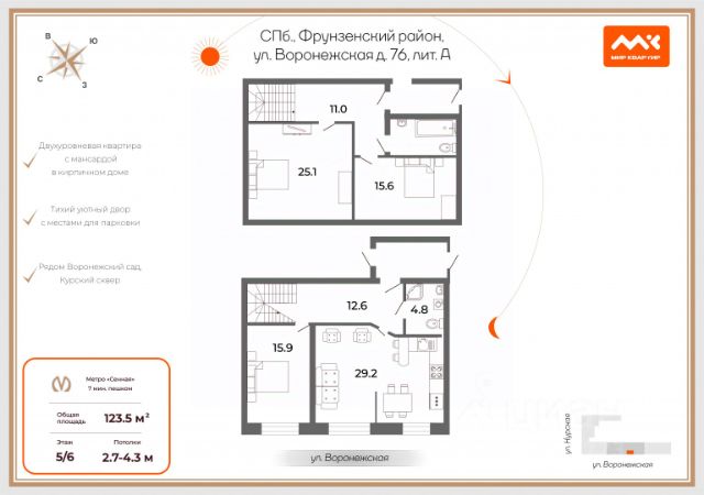 Клубный дом "Дуалист" - современный дом бизнес-класса с просторными квартирами в историческом центре Санкт-Петербурга в пяти минутах ходьбы от ст. м. "Обводный канал". Проект предлагает редкий формат жилья для тех, кто ценит подлинность Петербурга, но не готов жертвовать современным комфортом и технологиями. Классический фасад скрывает современный стиль жизни, а тишина зеленого двора соседствует с ритмом мегаполиса. Высота потолков - 3 метра, более 30 видов планировок с просторными кухнями-гостиными, окнами в ванных комнатах, саунами, французскими балконами, террасами с видом на исторический центр. Средняя площадь квартиры 79 м2. Всего 96 квартир в доме, коммерческие помещения на первом этаже и встроенный теплый паркинг. Высотность до 9 этажей, в проекте преобладают просторные двух- и трехкомнатные квартиры, площадь от 34 до 110 м2: большие окна, панорамное остекление и нестандартные планировочные решения для реализации ваших дизайнерских идей и комфортной жизни всей семьи. В квартирах на 9 этаже предусмотрена техническая возможность оборудования дровяного камина. В большинстве парадных по 3 квартиры на площадке, предусмотрены система видеонаблюдения, бесконтактный доступ в парадные и паркинг. Современный дизайн интерьеров мест общего пользования и придомовой территории, точка зарядки электромобилей, дизайнерское лобби для встреч и отдыха, консьерж-сервис. Все квартиры сдаются с отделкой white-box: стены подготовлены под финишную отделку (выполнены штукатурка и шпатлевка); разводка электропроводки с установкой розеток; коллекторно-лучевая разводка отопления в полу - панельные радиаторы с нижним подключением, внутрипольные конвекторы в зоне витражей; приборы учета; металлическая входная дверь. Удачное расположение обеспечивает жильцам столичный образ жизни в тихом малоэтажном историческом квартале: в пяти минутах ходьбы — станция метро "Обводный канал", в десяти минутах на транспорте — Московский вокзал и выезд на ШМСД. Из окон "Дуалиста" открывается вид на уютные питерские улочки и на Курский сквер, примыкающий к дому. Рядом — отреставрированная Покровская церковь 1890 года с уникальным майоликовым фасадом и Воронежский сад с зонами отдыха, детскими площадками и прогулочными аллеями. В шаговой доступности школы, детские сады, поликлиники, торговые и деловые центры, объекты культуры и искусства. Продажа квартир осуществляется по договорам долевого участия в строительстве. Объект аккредитован по ипотечным программам ведущими банками, проводятся сделки с участием всех видов сертификатов, субсидий, займов и по программам льготной ипотеки. Девелопер проекта - АО "СЗ "БФА-Девелопмент". Компания основана в 1991 году, специализируется на строительстве, реконструкции, реновации и реставрации объектов, в том числе имеющих особую значимость для города. Продам 4-комнатную квартиру элитные на улице Воронежская в Санкт-Петербурге.