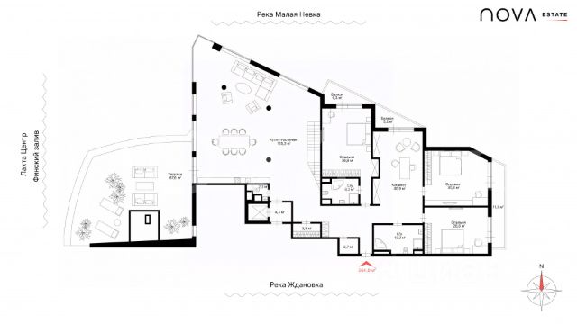 Арт. 131939982 Видовая резиденция площадью 364 кв. м с собственной террасой и индивидуальным лифтом в клубном доме Мальта, входящем в состав комплекса Леонтьевский мыс. Пространство выстроено вокруг главного архитектурного акцента — открытой панорамы на Финский залив и современный силуэт Лахта-центр, которые становятся естественной частью интерьера и меняют восприятие квартиры в течение дня. Резиденция расположена в камерной части комплекса с контролируемым доступом и приватной атмосферой проживания. Архитектура и общественные пространства формируют цельную среду: интерьеры общих зон выполнены по проекту Филипп Старк с использованием выразительных фактур и тщательно подобранных материалов, задающих спокойный и собранный характер дома. Планировочное решение строится вокруг масштабной общественной зоны. Кухня-гостиная площадью 165,3 кв. м рассчитана на разные сценарии жизни — от семейных вечеров до приёма гостей, сохраняя ощущение воздуха и свободного движения внутри пространства. Приватная часть включает четыре изолированные спальни, позволяя комфортно разделить личные зоны членов семьи. Особую роль играет терраса площадью 91.9 кв. м — полноценное продолжение жилого пространства под открытым небом. Здесь формируется отдельный сценарий жизни: утренний кофе с видом на воду, вечерний отдых или камерные встречи на фоне панорамы города и залива. Резиденция оснащена индивидуальным лифтом, обеспечивающим прямой доступ и высокий уровень приватности. Дополнительно возможно приобретение четырёх парковочных мест с кладовыми, что редкость для городских объектов подобного масштаба и упрощает повседневную организацию хранения и перемещений. Комплекс предлагает закрытую охраняемую территорию и собственную набережную для прогулок. Для резидентов доступны консьерж-служба 24/7, бильярдная, переговорные пространства и детский игровой клуб — инфраструктура, позволяющая решать рабочие и семейные задачи, не покидая территорию дома. Внутри комплекса расположены рестораны, пекарня, фитнес-центр, медицинские сервисы и повседневные городские функции. Дополняют окружение парковые пространства Крестовский остров и Каменный остров, находящиеся всего в нескольких минутах езды и формирующие природный баланс городской жизни. Это редкий формат городской резиденции — сочетание значительного метража, приватного доступа, панорамных видов и собственной террасы. Решение для покупателя, который ищет пространство с архитектурным масштабом и возможностью выстроить индивидуальный сценарий жизни внутри одного адреса.