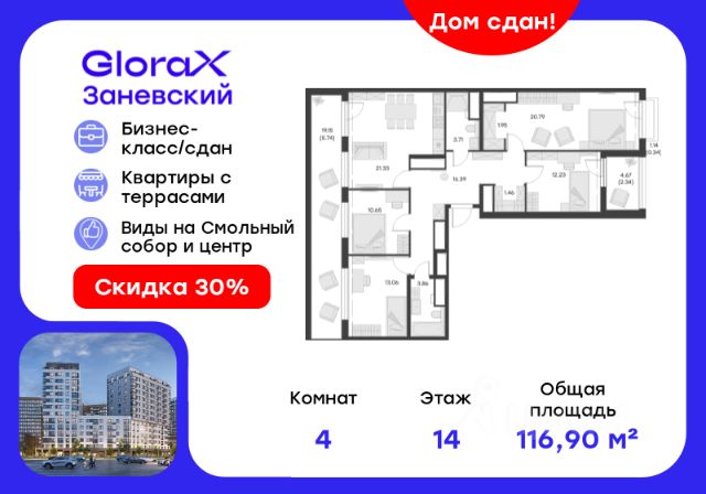Продается 4-комн. квартира на 14-м этаже в проекте бизнес-класса GloraX Заневский. Общая площадь лота составляет 98,46 кв. м, из которых 47,17 кв. м отведено под жилую и 16,61 кв. м под кухонную зону. Номер квартиры - 367. Дом сдан. Ключи сразу! Преимущества квартиры: терраса; кухня-гостиная; большая лоджия; 3 санузла. - Отделка White box - Увеличенные окна - Квартиры с террасами - Система "Умный дом" - IP-видеонаблюдение, Free Wi-fi на территории - Отапливаемый паркинг - Детская разновозрастная площадка - Комьюнити-центр для жильцов GloraX Заневский - современный комплекс бизнес-класса в шаговой в 2-х минутах от метро "Ладожская", для тех, кто не готов идти на компромиссы в вопросах комфорта и качества жизни. Мультифункциональный проект на 494 квартиры для стильных активных людей живущих в ритме большого города. GloraX Заневский располагается в экологически благоприятной локации. В пешей доступности находятся сад и 4 парка: парки Малиновка, Малоохтинский, Ладожский, Заневский и Яблоновский сад. У жителей мегаполиса есть уникальная возможность отвлечься от городской суеты и повседневных забот. 63 типа планировок от классических до евро-форматов, квартиры с террасами и уникальные квартиры с видом на динамичный Заневский проспект. Переменная этажность позволяет солнцу в равной степени освещать все квартиры, а увеличенная площадь остекления получить максимум дневного света. В проекте будет реализована собственная развитая инфраструктура: магазины и рестораны, детские площадки, фитнес-клуб, комьюнити-центр, уютные закрытый двор и прогулочный бульвар. GloraX Заневский не оставит равнодушными и любителей шоппинга, ведь всего в нескольких минутах пешей прогулки находятся крупные торговые галереи, кинотеатры, кафе и рестораны, среди которых ТЦ "Платформа", "Перрон", "Ладожские ряды", "Заневский каскад", "Нео", "Польза" и "Мебель Холл". GloraX Заневский это проект, использующий современные и технологичные решения, создающие комфорт и безопасность в повседневной жизни резидентов комплекса. Инновационная система "Умный дом" в жилом комплексе и в квартире обеспечивает согласованную работу всех инженерных систем и позволяют настраивать и опционально подключать необходимый дополнительный функционал. Для владельцев автомобилей мы спроектировали подземный отапливаемый паркинг на 295 машиномест, куда можно спуститься на лифте прямо со своего этажа. Цена указана при 100% оплате или стандартной ипотеке. Узнайте подробности в Отделе продаж.