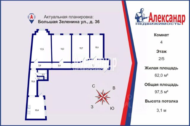 1705980 Очень интересное предложение в СУПЕР локации [см. фото]! - Просторная семейная квартира в окружении ЖК премиум - класса "Futurist", "Дом на Зелейной", "Классика" и др. - Впечатляющий вид на культурный центр "Левашовский хлебозавод" [см. фото] __________________ - 130 метров до Малой Невки - 8 минут до станции метро "Чкаловская" - 15 минут пешком до Приморского парка Победы и ЦПКиО. - рядом Крестовский, Петровский и Елагин острова, со всей их развитой развлекательной инфраструктурой: - стадион "Газпром Арена". - парк развлечений "Диво - Остров". - дельфинарий - "Каток у Флагштока" и "Большой каток на Елагином острове" - теннисные корты - бассейны - спа - комплексы _________________ Рядом: - лучшие государственные и частные школы/гимназии и детские сады - кружки и секции - Санкт-Петербургская детская школа искусств __________________ + огромный выбор сетевых продуктовых магазинов, пекарен, кондитерских, кафе, баров, ресторанов, стоматологический клиник, аптек, салонов, ювелирных магазинов и бутиков. __________________ Преимущества квартиры: - комфортный второй этаж - оптимальная площадь: 97,5 м² - очень светлая в квартире 8 окон - высокие потолки - 3,1 м - комнаты площадью 17,5/18,2/15,7/10,6 м² - ВАЖНО: между комнатами нет капитальных стен - возможна интересная перепланировка [см. фото]! - кухня 10,4 м² - кухонная плита: газ. - горячее водоснабжение: газовая колонка горячая вода круглый год! ________________ Преимущества дома: - камерный формат: всего 17 квартир дружные соседи, все вопросы касаемо поддержания чистоты, благоустройства дома и территории решаются оперативно - в доме произведён ремонт инженерных систем: - отопления: 2016 г. - холодного водоснабжения: 2017 г. - канализации: 2019 г. - электроснабжения: 2020 г. - газоснабжения 2021 г. - чистая широкая парадная лестница, с оригинальными перилами, на всех этажах установлены стеклопакеты [см. фото] - закрытый двор с парковочным местом _________________ Звоните! Обсудим детали и договоримся о просмотре.