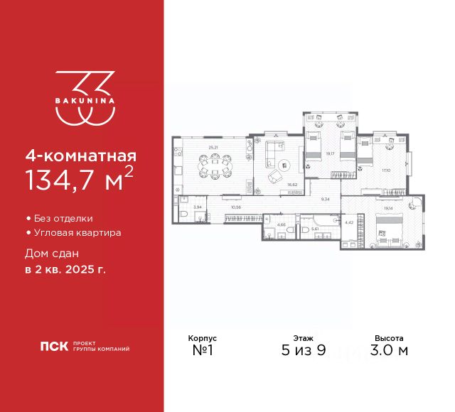 Просторная 4-комн. квартира в ЖК "BAKUNINA 33" на 5 этаже. Квартира без отделки, новый владелец может сделать ремонт по своему дизайн-проекту. Общая площадь: 134.7 кв.м., жилая: 72.03 кв.м., площадь просторной кухни-столовой: 25.21 кв.м. Квартира угловая, идеально подойдет любителям тишины и панорамных видов. В квартире три совмещенных санузла. Высота потолков 3.0 м. Дом монолитный, трехподъездный, высотой 9 этажей. Квартира находится во 2-й секции в корпусе 1. На этаже 5 квартир. В подъезде 1 пассажирский и 1 грузовой лифт. Начало строительства - 2 квартал 2023 года. Строительство окончено, дом сдан во 2 квартале 2025 года. Оформление сделки по договору купли-продажи. В шаговой доступности от дома расположены станции метро (расстояние по прямой): "Площадь Александра Невского" (700 м), "Площадь Александра Невского 1" (700 м), "Площадь Александра Невского 2" (800 м), "Площадь Восстания" (1.4 км), "Новочеркасская" (1.5 км), также недалеко от этого корпуса расположены станции метро: "Владимирская", "Чернышевская", "Ладожская". Клубный дом BAKUNINA 33 - новый стандарт престижной жизни в Центральном районе. В 10 минутах от Невского проспекта и в двух минутах от Синопской набережной и Невы, в благоустроенной и знакомой среде. Локация клубного дома Bakunina 33 - идеальное место для погружения в культурную и светскую жизнь Санкт-Петербурга. В 10-15 минутах на машине почти все знаковые достопримечательности города: Эрмитаж, Русский музей, Александринский и Мариинский театры, БДТ, Таврический парк Казанский собор, Спас на крови и другие величественные дворцы, соборы, музеи, ради которых в город ежегодно съезжаются тысячи гостей. Каждая линия и каждый элемент дизайна дома является частью целостной концепции. Облик здания гармоничный, классически сдержанный с выверенными пропорциями и элегантными формами. Цветовые и архитектурные решения и эркеры придают облику дома легкость, доступную лишь респектабельной классике. Фасады привлекают внимание плавными ритмичными переходами. Вертикальная разбивка колоннами визуально устремляет здание ввысь. Плоскость фасадов декорирована разными элементами из гранита. Ограждение балконов, эркеры и колонны дополнены лаконичным геометрическим орнаментом в акцентном теплом сером цвете. Первые два этажа дома облицованы натуральным гранитом тёмного оттенка. Основной объём здания - выполнен штукатурным фасадом с окраской светлыми тонами из цветовой палитры " Традиционные цвета Санкт-Петербурга". Верхний этаж выполнен в стиле мансарды с высотой потолков в квартирах 3,5 метра. Этим достигается цель гармоничного и сомасштабного существования в одном фронте с существующими зданиями. За венчающим карнизом располагаются балконы девятого этажа. Ограждения балконов дополнены геометрическими узорами. Закрытый внутренний двор со сквером и детской площадкой. Острова зелени с водной чашей в центре создают ощущение гармонии и умиротворения. Современная уличная мебель и освещение формируют домашнюю атмосферу уюта и предст