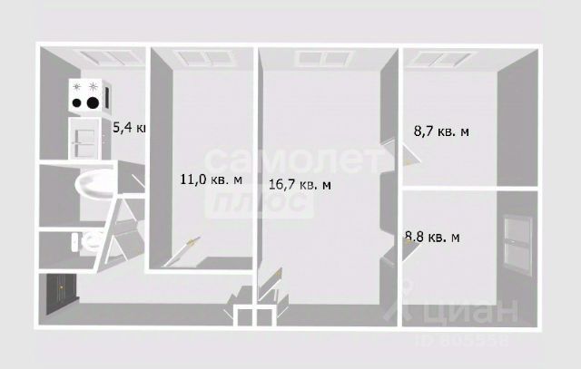 Три изолированные просторные комнаты 17,2 кв.м., 16,7 кв.м. и 12,0 кв.м..