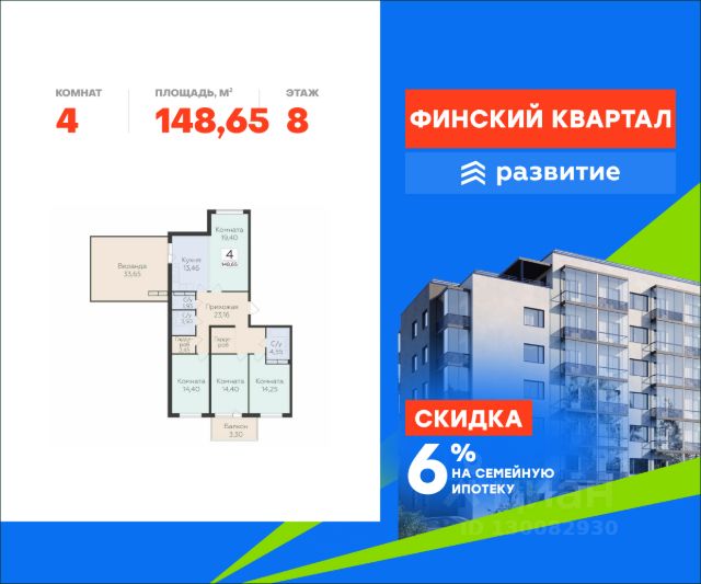 Продается квартира площадью 148.65 кв. м с отделкой white box. Квартира расположена на 8 этаже 8 этажного дома, в жилом комплексе комфорт-класса "Финский Квартал". "Финский квартал" - это уникальный проект комфорт-класса для тех, кто хотел бы жить на природе, но при этом находиться вблизи Северной столицы. Расположенный в окружении одного из самых крупных парков Ленобласти - Лахтинского, проект предлагает своим жителям доступную инфраструктуру, комплексное благоустройство территории, 6 секций переменной этажности с современной архитектурой, которая гармонично дополнит район и будет радовать проживающих еще много лет. Найдите свою идеальную квартиру в ЖК "Финский Квартал"! Расположение Пешком: - 5 мин. до детского сада и супермаркета; - 8 мин. до остановки "Зеленая улица"; - 10 мин. до лесопарковой зоны. На автомобиле: - 3 мин. до Приозерского шоссе; - 10 мин. до Выборгского шоссе; - 12 мин. до КАД; - 30 мин. до ст. метро "Проспект Просвещения". Благоустройство - большой яркий двор с ландшафтным дизайном; - живая изгородь, кустарники и хвойники; - умное зонирование тихих и активных площадок; - сквер для прогулок и отдыха; - изумрудные лужайки для пикников; - дорожки для пешеходов и велосипедистов; - большие игровые площадки; - мягкое покрытие для безопасности детей; - тренажеры, турники и веревочные комплексы; - пространство только для пешеходов - без машин; - наземная парковка за пределами двора; - специальные площадки для выгула питомцев; - светлые дизайнерские холлы; - светопрозрачное остекление и большие окна; - декоративная подсветка парадных; - колясочные помещения для комфорта родителей; - места для хранения велосипедов и самокатов. Окружение - свежий воздух: парк усадьбы "Осиновая Роща", Лахтинский парк, лесопарк "Курортный", Левашовский заказник, Ново-Кавголовский лесопарк; - водные объекты: Сестрорецкий Разлив, пляжи у Тохколодского и Большого озер, залив Сярюнлахти; - инфраструктура: 2 детских сада, школа, кафе, продуктовый супермаркет, больница; - для крупных покупок: ТРЦ "Китай-Город", "Мега-Парнас"", "Гранд Каньон"; - активный отдых: горнолыжные комплексы "Охта-Парк" и "Токсово", конный клуб "Осиновая Роща", ФОК "Норус". Продам 4-комнатную квартиру в сельском поселении Юкковское Всеволожского района.