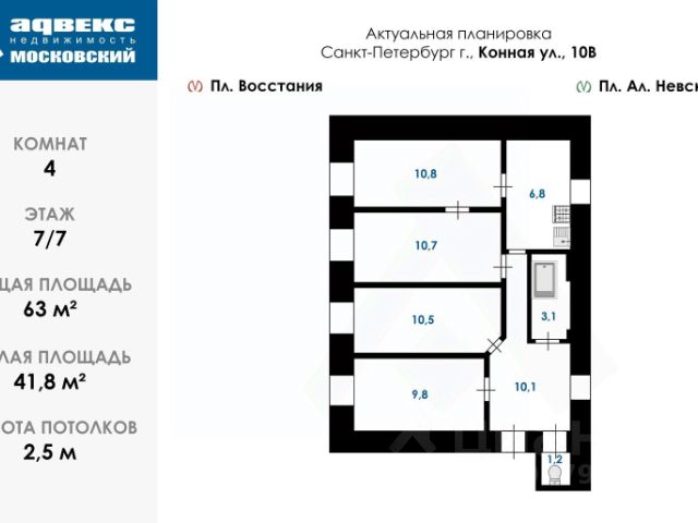 • ✓ В базе Циан 1 4-комнатных квартир на последнем этаже на улице Конная в Санкт-Петербурге