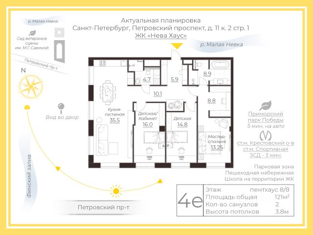 Продаётся 4-комнатная квартира в ЖК "NEVA HAUS" на 7 этаже. Общая площадь составляет 152.20 кв. м. Квартира без отделки. Жилой комплекс "NEVA HAUS" располагается по адресу Санкт-Петербург, Петроградский. NEVA HAUS - элитный жилой комплекс в самой зеленой части Петровского острова, в точке слияния двух рек, напротив Крестовского острова. У жителей появится благоустроенная набережная с пирсом и павильон с необходимыми сервисами и услугами. Потолки до 3,8 м, увеличенные деревянно-алюминиевые окна, современные технические решения, закрытая территория и внутренняя инфраструктура - важные слагаемые качественной жизни в NEVA HAUS. Расположение: • 4 мин на авто до Крестовского острова; • 5 мин на авто до Приморского парка Победы; • 6 мин на авто до станции метро "Крестовский остров"; • 18 мин на авто до ЗСД; • 20 мин на авто до Стрелки В.О. и исторического центра города. NEVA HAUS стал первым элитным жилым комплексом в Санкт-Петербурге, официально получившим статус энергоэффективного, водоэффективного и экологичного объекта по системе GREEN ZOOM. Для удобства жителей, квартира будет подключена к IP-домофонии, на гостевой парковке предусмотрены зарядки для электромобилей. В квартире устроена ниша для размещения кондиционеров, индивидуальные каналы вентиляции, отверстия на фасаде для современных приточно-вытяжных систем, пятиступенчатая очистка воды, коллекторная разводка труб отопления и дерево-алюминиевые окна соответствуют высокому классу жилья. Преимущества: • Высокие потолки, до 3.8м; • Повышенная звукоизоляция между квартирами; • Закрытая охраняемая территория, видеонаблюдение; • Благоустроенная приватная набережная; • Система "Умный дом"; • 5-ти ступенчатая система очистки воды; Успейте приобрести квартиру на выгодных условиях! Чтобы узнать подробности, обращайтесь за консультацией по телефону.